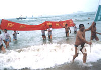北京申辦2008年奧運(yùn)會(huì)的成功也給申辦協(xié)作伙伴城市青島帶來商機(jī)。圖為青島啤酒廠職員休,假日在沙灘海浪中歡慶勝利。中新社記者 鄭萍萍 攝