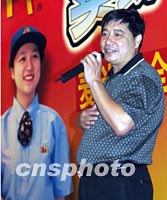 北京七十一家麥當勞餐廳職員與暑期在京實踐的高校大學生共八百多人,十五日舉行“歡慶北京申奧成功大會”,抒發對北京申奧成功的喜悅。圖為著名運動員王義夫在會上即興演唱歌曲《紅旗飄飄》。中新社記者 錢興強 攝