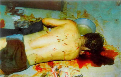 馬健民,男,54歲,華北油田退休職工。其家人稱,馬已練習“法輪功”兩年左右,達到了癡迷的程度,時常出現精神恍惚和失常,堅持認為自己的腹部有個“法輪”。1998年9月4日馬健民在家中用剪刀剖腹尋找,因救治不及時死亡。這是馬健民自殺后的慘景。新華社發