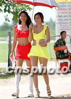 八月的泰國曼谷,熱浪襲人,兩名靚女身著艷麗涼爽的服裝、手持太陽傘漫步街頭,十分搶眼。中新社記者 趙振清 攝