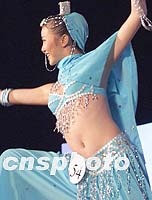 正在青島舉行的戴安娜2001世界精英模特大賽中國預選賽暨金沙灘模特大賽上,模特選手不僅要具有美妙的身材,還要多才多藝。圖為一名選手表演新疆舞。中新社記者 錢興強 攝