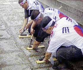 圖文:韓國20人斬斷手指抗議小泉參拜靖國神社 2001年08月13日 15:06 ![]() 法新/圖 中新網北京8月13日消息:韓國漢城二十人公開斬斷手指,以血抗議日本首相小泉純一郎參拜靖國神社。 據韓國電視臺報道,二十名男子在漢城獨立門前抗議,高叫口號,指責小泉純一郎到供奉戰犯的靖國神社參拜。男子接著拿出長柄大鐮刀,斬斷尾指抗議。 有目擊者表示,該批男子較早時被阻止在日本大使館前示威。警方暫時沒有評論事件。 |