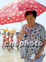 日前,在青島參加戴安娜2001世界精英模特大賽中國(guó)預(yù)選賽的模特選手,來(lái)到風(fēng)景秀麗的金沙灘景區(qū)拍攝。圖為一位沙灘漫步的打傘老人匆匆從身穿泳裝模特身邊走過(guò)。中新社記者 錢(qián)興強(qiáng) 攝
