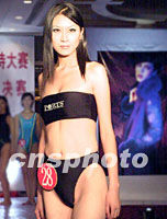“2001年新絲路中國(guó)模特大賽‘軒妮杯’新疆區(qū)選拔賽”十九日在烏魯木齊市舉行。本次比賽共有來自新疆的90名女選手、64名男選手參加。圖為參賽選手進(jìn)行泳裝展示。中新社圖 劉新 攝