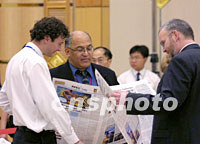 二十九日在上海開幕的第八屆APEC中小企業部長會議上,與會官員和代表紛紛關注上海的媒體信息。中新社記者 潘索菲 攝