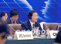 二十九日在上海召開的APEC中小企業部長會議主題是:“新世紀、新挑戰:創新與發展環境”。圖為會議主席、中國國家經濟貿易委員會主任李榮融作開幕講話。中新社記者 潘索菲 攝