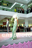 新近落戶昆明的臺灣蘇菲雅婚紗時尚,日前在昆明柏聯廣場進行了十款創新的婚紗和晚禮服時尚表演,吸引了許多前來購物的顧客。該公司總經理陳愛珠女士說,這些表演主要是把婚紗時尚的神秘性和趣味性介紹給春城的年輕人。圖為表演中的一個場面。中新社圖 納家驊 攝