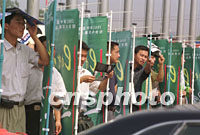 西安市民五日在烈日下靠廣告牌遮陽觀看貿易洽談會開幕式,等待進入展廳。本屆展會上的現代化民用產品吸引了眾多參觀者。中新社記者 宋吉河 攝