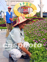 第八屆APEC財(cái)長(zhǎng)會(huì)議近日在中國(guó)江蘇省蘇州市舉行,為歡迎各國(guó)會(huì)議代表的到來(lái),蘇州市在大街小巷擺放了七十六萬(wàn)盆鮮花裝點(diǎn)市容,這是蘇州市觀前街路口的花壇前,清潔工人正在護(hù)理擺放的鮮花。中新社記者 李剛 攝