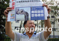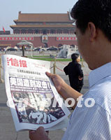 十二日晨,美國遭襲后的消息在報紙刊登后,北京天安門廣場的游客仔細閱讀有關(guān)消息。中新社記者 錢興強 攝