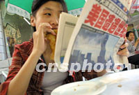 十二日清晨,在路邊吃早餐的北京市民關(guān)注當(dāng)日報紙所載美國“爆炸事件”。中新社記者 鄭萍萍 攝