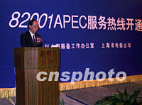 上海電信正全力為APEC構建一個包括由窄帶與寬帶、有線與無線組成的具有海底光纜、陸地光纜、衛星地球站等“通信服務保障體系”,為中外來賓提供國內外衛星、語音、數據、因特網和視像會議等全方位的通信服務。圖為近日舉行82001APEC服務熱線開通儀式。中新社圖 鄭建平 攝