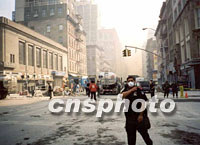 圖中煙霧處就是美國紐約倒塌后的世貿大樓。現在街上只有戴面罩的軍人和警察來回巡視。中新社圖