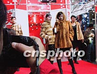 2001烏魯木齊“絲綢之路”國際服裝服飾節暨烏魯木齊國際服裝服飾品牌展示會于日前在烏魯木齊開幕。圖為來自東北的某裘衣廠展臺前亮麗的時裝模特,吸引眾多的參觀者駐足。中新社圖 劉新 龍新 攝