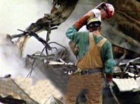 九月十一日撞擊美國世貿大樓的一客機主體日前被挖出,這截主體殘骸大約有三米長,挖出后馬上被聯邦調查局人員運走進行檢查。