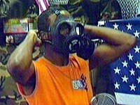紐約人日前爭購放毒面具,以免受到恐怖主義可能進行的生化武器的襲擊。圖為一紐約青年正在選購防毒面具。