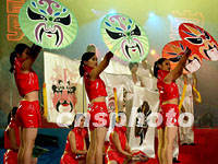 正在青島舉行的2001中國青島時裝周暨服裝服飾博覽會上,日前舉辦大型文藝演出。圖為身穿現代服飾的模特舉著京劇臉譜表演。中新社記者 錢興強 攝