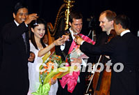 由奧斯卡金像獎獲得者譚盾(右一)指揮、由多名國際音樂家和上海交響樂團演出的"臥虎藏龍"音樂會,4日晚在"第十五屆澳門國際音樂節"演出成功后,周潤發向音樂家表示祝賀。中新社圖 任晨鳴 攝