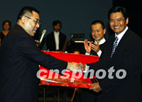 香港巨星周潤發4日到澳門出席"第十五屆澳門國際音樂節"中的"臥虎藏龍"音樂會后,澳門特區政府社會文化司司長崔世安向周潤發頒發紀念品。中新社圖 任晨鳴 攝