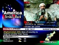 美軍協同英軍開始對阿富汗境內恐怖組織訓練營以及塔利班政權的軍事設施展開軍事打擊。其后不久,卡塔爾一家電視臺首先播放了本·拉登講話的錄像。拉登說:“我對真主起誓,除非巴勒斯坦人民能夠享受到和平,否則美國人將永遠不知和平為何物。”美國有線電視網(CNN)在其黃金時間的節目中,反復播放拉登的錄相,提醒人們警惕新的恐怖報復行動。