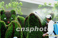 上海園林工人為街頭的綠色植物雕塑噴水美化,迎接十月APEC會議。中新社記者 賈國榮 攝