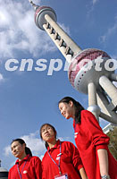 兩千七百名大學生為上海APEC會議當志愿者,13日會議召開前夕,其中幾名學生在他們服務的新聞中心前留下難忘紀念。中新社記者 王瑤 攝