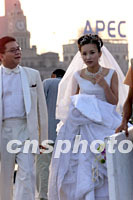 一對年輕夫婦十三日在上海濱江路拍攝結婚照,背景的高樓上豎立著APEC標記。亞太經合組織高峰會開幕在即,上海迎來青年人的結婚高峰。中新社記者 毛建軍 攝