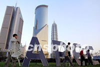 本屆APEC會議的新聞發布廳設置在上海東方明珠大廈,新的APEC霓紅標識十三日正在大廈前的廣場草坪上進行裝備,它的背景是上海浦東的經典建筑:金茂大廈、中銀大廈、中保大廈。中新社圖 劉殊瑾 攝