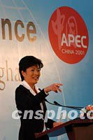 2001年APEC會議中國籌委會秘書處發言人章啟月,十四日在新聞中心就2001年APEC會議總體安排問題舉行新聞發布會,回答中外記者提問。中新社記者 王瑤 攝
