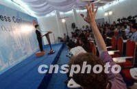2001年上海APEC會議中國籌委會秘書處發言人章啟月,十四日在新聞中心就2001年APEC會議總體安排問題舉行新聞發布會,中外記者就大會議題、安全保衛等問題踴躍提問。中新社記者 王瑤 攝