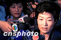 APEC籌委會秘書處發(fā)言人章啟月十五日在上海APEC新聞中心舉行記者會后,再度被港、臺記者包圍提問。中新社記者 毛建軍 攝