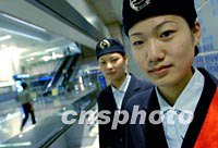 身穿新制服的空港服務小姐16日在上海浦東國際機場微笑迎賓,出席上海APEC會議的各國貴賓于近日陸續乘機抵達。中新社記者 王瑤 攝