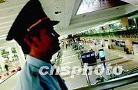 16日一名停止休假的保安人員警惕關注著上海浦東國際機場候機大堂,出席上海APEC會議的各國貴賓于近日陸續乘機抵達。中新社記者 王瑤 攝