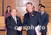中國對外經(jīng)濟(jì)貿(mào)易合作部長石廣生(左)十六日在上海國際會議中心會見前來參加亞太經(jīng)合組織(APEC)會議的新西蘭貿(mào)易談判部長吉姆·薩頓。中新社記者 毛建軍 攝