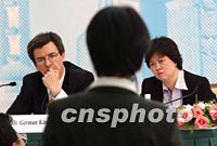 APEC貿易投資委員會執行主席GERMAN KING(左),十七日在上海國際新聞中心召開新聞發布會,他在回答中外記者提問時說,貿易和投資自由化的推動將有利于減弱恐怖活動對世界經濟的不良影響。中新社記者 王瑤 攝