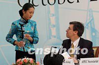 身著旗袍的上海小姐為APEC會議服務,在十七日召開的新聞發布會上,APEC貿易投資委員會執行主席GERMAN KING向服務小姐點頭致謝。中新社記者 王瑤 攝