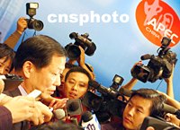 中外記者十月十七日在上海圍住中國國家經(jīng)貿(mào)委主任李榮融,APEC國際新聞中心邀請他介紹中國經(jīng)濟(jì)與國企改革以及新近的美國考察之行,引起媒體的關(guān)注。中新社記者 賈國榮 攝