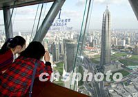 采訪上海APEC會議的記者十七日登上東方明珠塔觀看上海新景象。出席APEC會議的政要們亦將在這里感受上海這顆“東方明珠”的魅力。中新社記者 毛建軍 攝