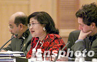 10月17日,2001年亞太經(jīng)合組織(APEC)部長(zhǎng)級(jí)會(huì)議在上海國(guó)際會(huì)議中心開(kāi)幕。這是馬來(lái)西亞貿(mào)工部長(zhǎng)拉菲達(dá)·阿齊茲在會(huì)上發(fā)言。中新社圖