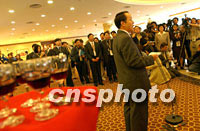 2001年APEC會(huì)議籌委會(huì)秘書長、中國外交部副部長王光亞十七日在上海國際新聞中心舉行招待酒會(huì),答謝報(bào)道上海APEC會(huì)議的中外記者。中新社記者 王瑤 攝