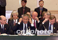 美國國務卿鮑威爾(右二)與貿易代表左立克(右一)十八日上午在上海國際會議中心出席亞太經合組織(APEC)雙部長會議。中新社記者 毛建軍 攝