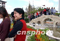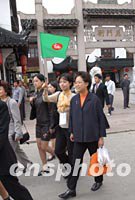 出席APEC雙部長會議的部長夫人們十八日到千年水鄉(xiāng)古鎮(zhèn)朱家角游覽,圖為香港工商局長周德熙夫人黃英琦(右)參觀古牌樓。中新社記者 王瑤 攝