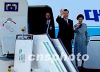 韓國總統金大中和夫人乘坐專機十八日下午抵達上海浦東國際機場,出席APEC峰會。中新社記者 賈國榮 攝