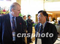 香港上海匯豐銀行主席艾爾敦(左)等一行十九日在上海出席APEC工商領(lǐng)導(dǎo)人峰會,艾爾敦還將就亞太地區(qū)的未來趨勢和問題作專題演講。中新社記者 潘索菲 攝