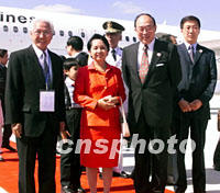 10月19日,前來參加亞太經(jīng)合組織領(lǐng)導(dǎo)人非正式會議的菲律賓總統(tǒng)阿羅約抵達(dá)上海。這是阿羅約總統(tǒng)(中)和到機(jī)場迎接的中國財政部長項懷誠(右二)合影。中新社圖