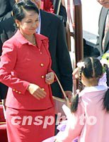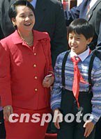 菲律賓總統(tǒng)阿羅約(左)十九日中午到達(dá)上海浦東機(jī)場,她將參加二十一日的APEC領(lǐng)導(dǎo)人非正式會議。中新社圖 劉殊瑾 攝