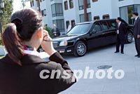 一名上海姑娘十九日在中美領(lǐng)導(dǎo)人會談場外被布什總統(tǒng)的座駕所吸引,拿起相機拍照留念。中新社記者 賈國榮 攝