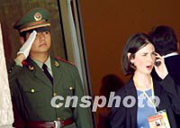 十月十九日,在上海中美首腦會談場外,一名美國白宮女記者忙于打手機電話,身邊的中國軍警正在向來賓行軍禮。中新社記者 賈國榮 攝