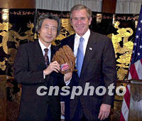 10月20日,美國總統布什(右)在上海下榻的酒店會見日本首相小泉純一郎。圖為布什向小泉贈送棒球手套。中新社圖