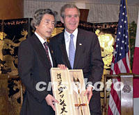 10月20日,美國總統布什在下榻的酒店會見日本首相小泉純一郎。圖為小泉純一郎(左)向布什贈送禮品。中新社圖